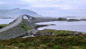Bei der Weiterfahrt über die RV64 Richtung Molde erreichen wir nun das Kernstück der Atlantikstraße. Es führt über zwölf niedrige Brücken (die höchste ist 23 m hoch),über kleine Inseln die ins Meer hinausragen und bietet viele interessante Ausblicke auf den Atlantik und das Seegebiet der Hustadvika. Schöne Rastplätze laden zu Pausen ein und man sollte sich die Zeit nehmen den Blick auf das Meer zu genießen.